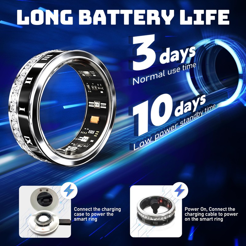- 【𝐁𝐚𝐭𝐭𝐞𝐫𝐲 𝐋𝐢𝐟𝐞】The sleep tracker ring has a 3-7 day battery life and can be fully charged in 1 hour. With a 300mAh mini charging box, the fitness tracker ring can provide 10-15 charging cycles for the ring, ensuring a long-lasting and stable battery life experience.