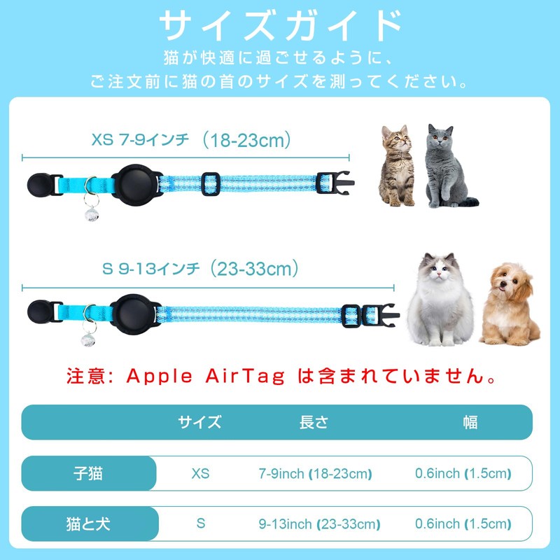 - Pet Collar Product Specifications: XS size: Thickness approx. 0.6 inches (1.5 cm), Length is adjustable, Length is minimum 7.1 inches (18 cm), Maximum is 9.1 inches (23 cm); Size S: Approx. 0.8 inches (1 cm); Length is adjustable; Length is minimum 9.1 inches (23 cm); Weight: 0.7 oz (20 g); Small pet collar is too large for kittens. Comes with 2 bells (1 silver + 1 gold) Note: The item does not include airtag, you need to buy the airtag yourself