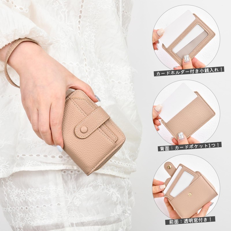 Ganve Card Case with Coin Purse with Short Hand Strap, Women's, Stylish, Small, Mini Wallet, Women's, Compact, Portable, Large Capacity, Synthetic Leather, Wallet, Multi-functional, Commuter Purse, Women's, Cute, Pass Case, High School Students, Popular, IC ID Card Holder, Business Card Case, Apricot