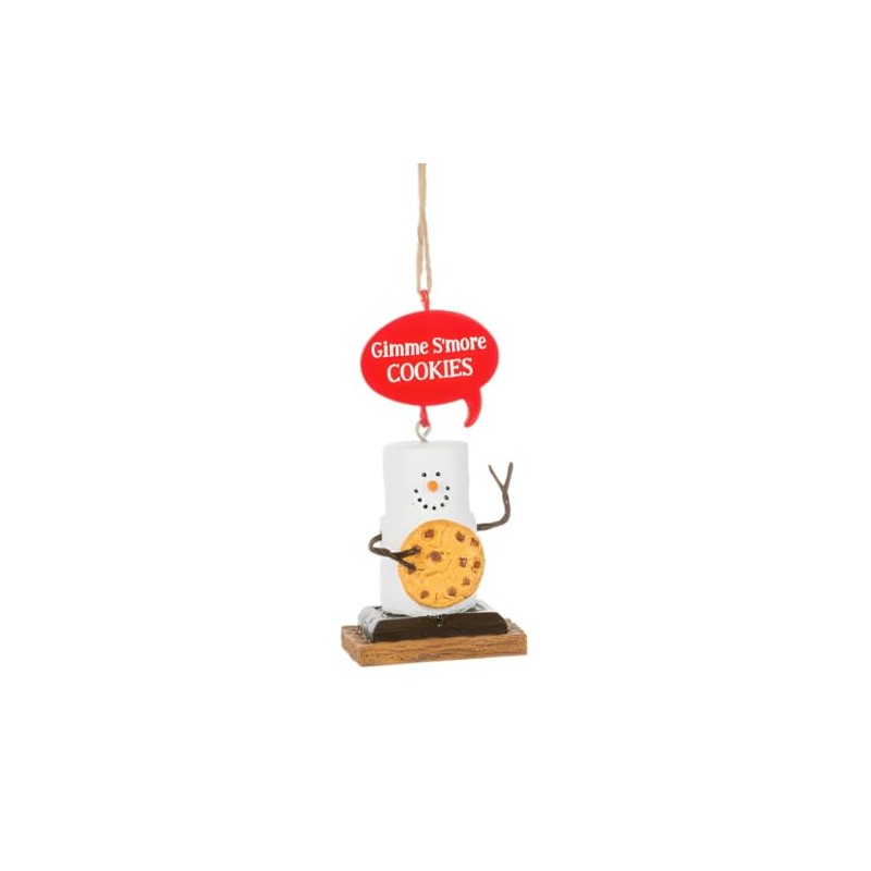 Satisfy your holiday sweet tooth with the Ganz Smores Cookies Ornament! This cheerful marshmallow snowman is holding a giant chocolate chip cookie while a bright red speech bubble overhead boldly declares, “Gimme S’more Cookies.” Crafted from durable resin and standing 4 inches tall by 2.25 inches wide, this playful ornament rests on a classic chocolate and graham cracker base. It’s the perfect festive treat for cookie lovers, dessert enthusiasts, and anyone who loves a little sugar and a lot of smiles on their Christmas tree.
