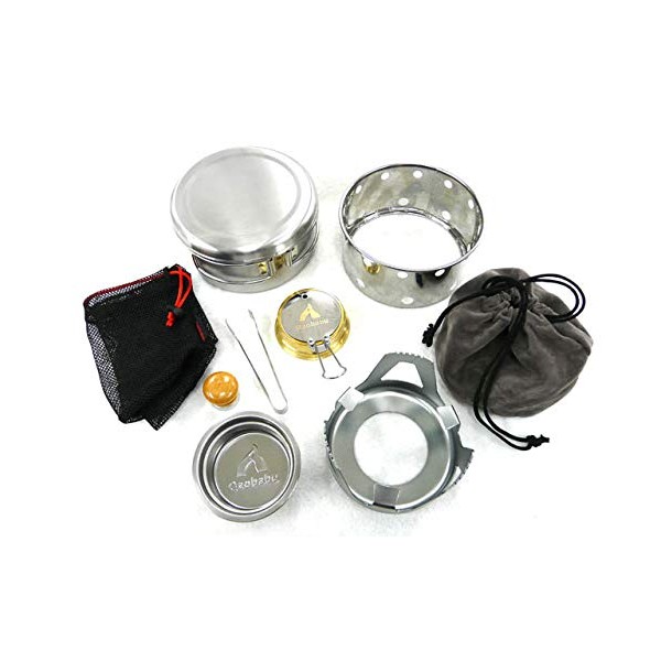 - ■ Set Includes: Gaobabu Stainless Cooker 700ml (with lid), Solid Fuel Tray, Gaobabu Alcohol Burner, Flame Adjustment / Fire Extinguishing Lid, Trivet Base, Kintaku Bag for Storage Trivets Base, Windshield for Trivets Base, Magnetic Knob, Mini Tongs, Mesh Storage Bag 120-120
