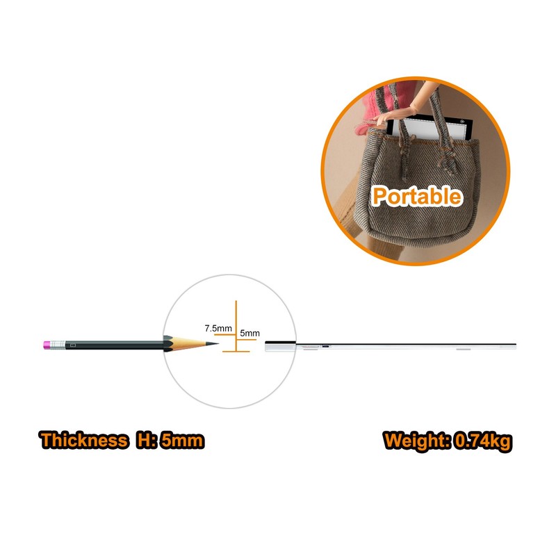 - (ULTRATHIN AND LIGHTWEIGHT DESIGN) --- Thickness:5mm/Weight: 0.74 KG, light and stylish, lightpad is portable and can be stored easily; Moderate Size ---Diagonal: 19.59 inches (49.78cm)/Scale: 35 x 25 cm/Illuminated Area: 14.13 x 10.19 inches (359mmx259mm)/Dimension: 15.63 x 11.81 x 0.2 inches(398 x 300 x 5.15 mm). Bigger than A4 size, suitable for tracing, tattoo transferring, calligraphy and so on.