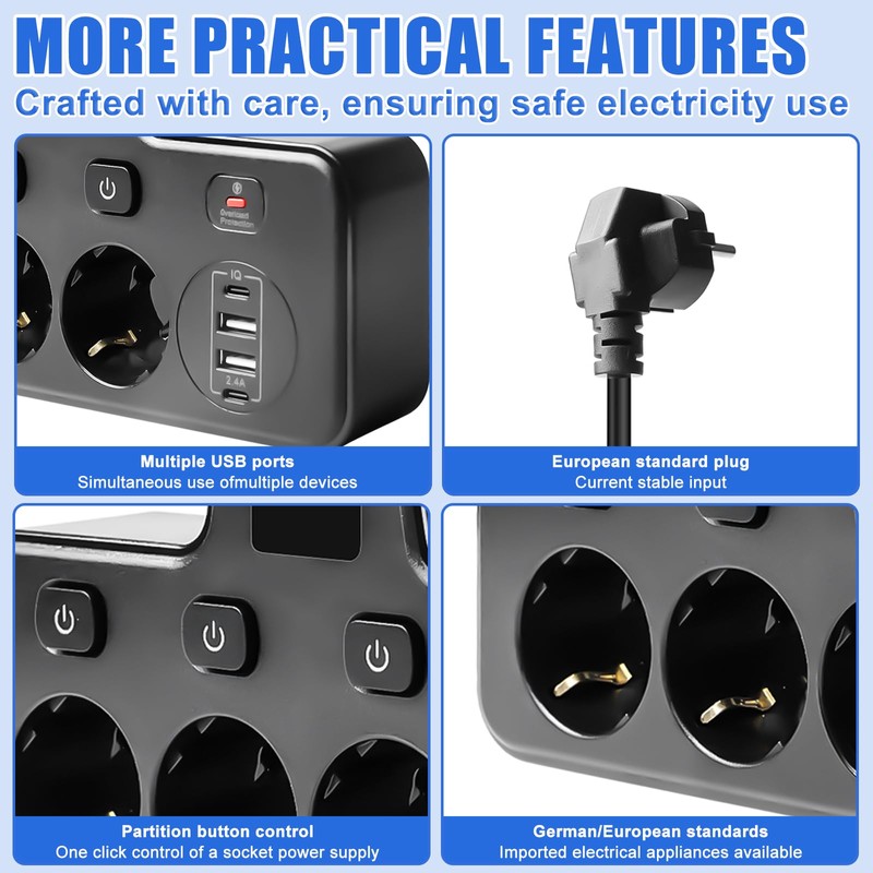 • 6 in 1 Steckdosenverlängerung: Die Steckdosenleiste verfügt über 3 Fach EU Steckdosen und 3 USB A + 1 TYPE C-Anschlüsse, die 6 Geräte gleichzeitig mit Strom versorgen können. Leistung bis 2500 W (max. 250 V, 10 A). Die Steckdosenleiste 2-Fach mit USB Anschlüsse eignen sich für das Aufladen fast aller USB Geräte, ist ideal für Reisen, Zuhause, Büro, Schule und mehr.
