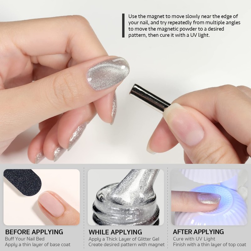 • GLITTER CAT EYE: Use the magnet to create desired pattern before curing. Apply gel top coat for gorgeous shimmery and sparkly finish. Heat up in winter to reduce thickness. Cure with UV light for 60s to dry.