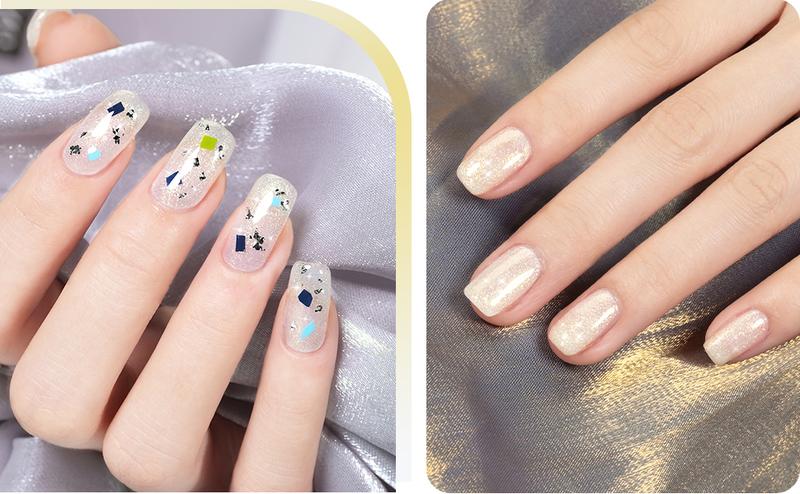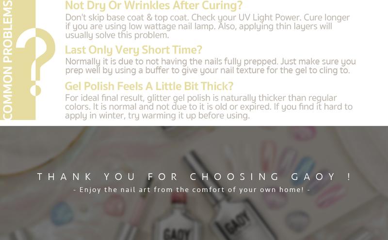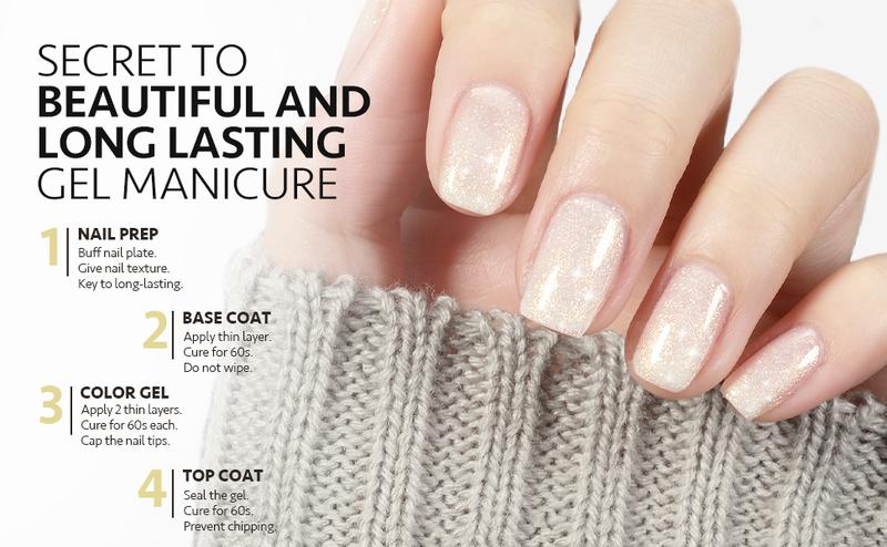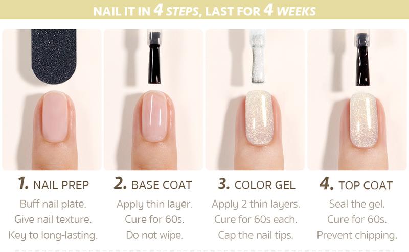 4 WEEKS LONG-LASTING: Buff your nail bed before base coat to give your nail texture. Apply top coat after color gel for shimmery jelly finish.