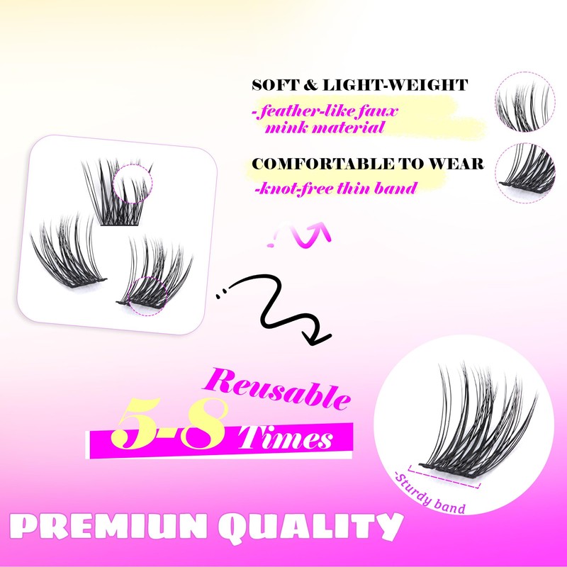 • 💖 Easy Application & Professional Looking: An easy challenge! Our cluster lashes provide an effortless way to accentuate your eyes without any hassle. Designed to be knot-free and long-lasting, our false lashes give you the confidence to look your best all day long.