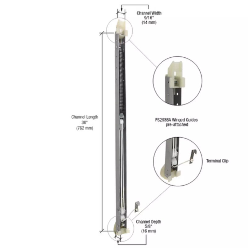Description: Window Balance Channel Block & Tackle for Non-Tilt Windows Set-up: Includes balance channel, shoe, and top. Measures: The metal channel's width is 9/16", but is considered 1/2" in the tradeCategory: Window Channel Block and Tackle BalanceMaterial: Aluminum (Plastic Balance Shoes and Tops)Usage: Used On Single Or Double Hung Windows To Counter Sash WeightNumber: 2930Window Balance - 2930- Channel Block & Tackle for Non-Tilt Windows