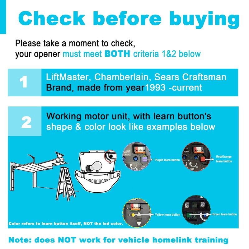 The replacement garage door opener keypad and remote are only compatible with Sears Craftsman, LiftMaster, and Chamberlain garage door openers with purple, red/orange, yellow, or green learn buttons (mounted in the garage) produced from 1993 to the present, using Security+ 315 MHz / 390 MHz or Security+ 2.0 MyQ or Billion Code technology.
