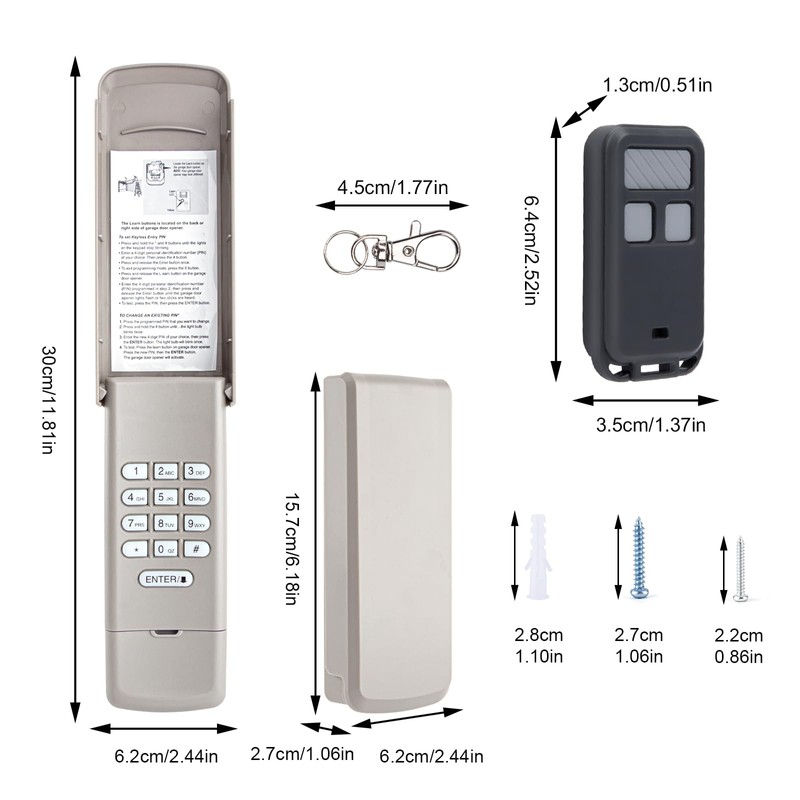 Package includes: one garage door keypad + 2 garage door remotes + 2 keychains + user manual