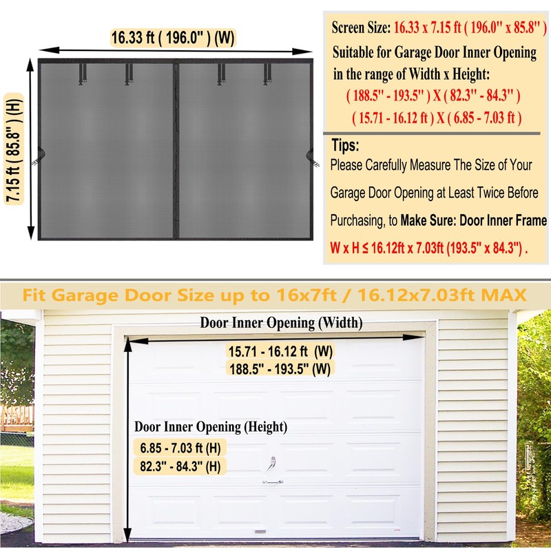 - [IMPORTANT REMINDER] - The size of our Garage Door Mesh Screen is: 16.34 x 7.15ft (195.5'' x 85.8''), and it fits Garage Door Inner Opening Width: 15.71ft ~ 16.12ft (188.5'' ~ 193.5'') & Garage Door Inner Opening Height: 6.85ft ~ 7.03ft (82.3'' ~ 84.3''). [NOTE] - Before Purchasing, please carefully measure the size of your garage door opening at least twice, to make sure: Door Inner Frame W x H ≤ 16.12ft x 7.03ft.