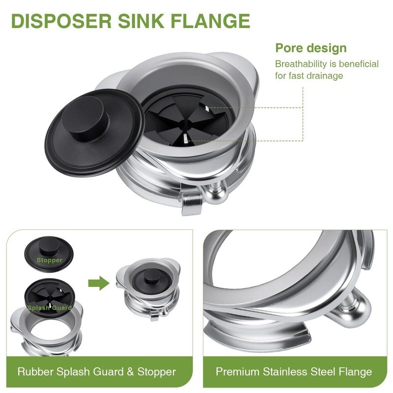• Premium Material:The garbage disposal drain kit features a high precision, polished 304 stainless steel flange that promises longevity and robustness, supporting weights up to 110lbs. The splash guard and stopper are made from premium rubber, this splash guard is heat-resistant, flexible, easy to clean and reduce the noise made by your garbage disposer.