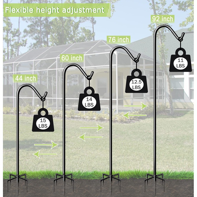 - Flexible & Sturdy: This metal garden hanging stake can be freely adjusted to different height options due to our novel extenders’ design: 44”, 60”, 76” or 92”, depending on what you would like to hang and how many extension pipes you use. Heavy-duty steel ensures the surface is rust-proof, water-proof and more serviceable.