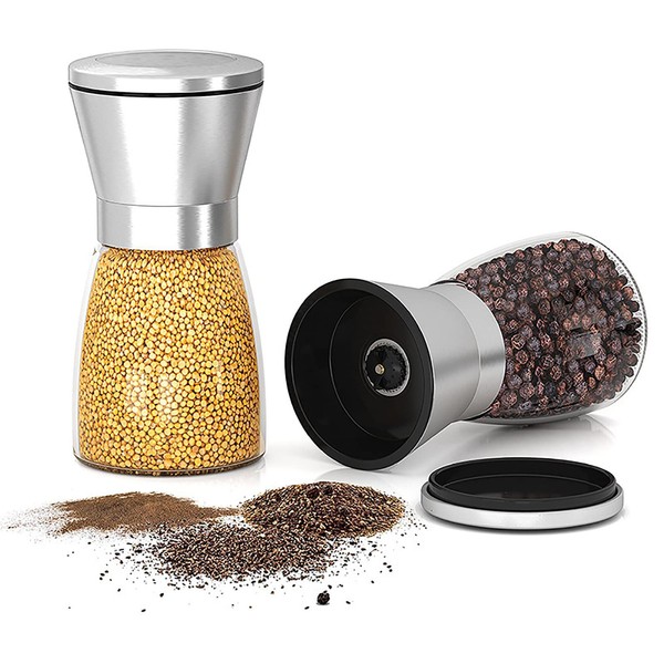 GARCIAS Juego de molinillos de sal y pimienta, paquete de 2 molinillos de pimienta recargables de acero inoxidable, saleros y especias de vidrio de 180 ml para sal marina, pimienta negra o especias