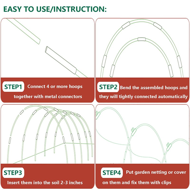 - Easy to Use: Just combine 4 or more hoops with connectors and bend the assembled hoops and insert them into the soil 2-3 inches. You can DIY a suitable growing tunnel for your plants according to your needs.