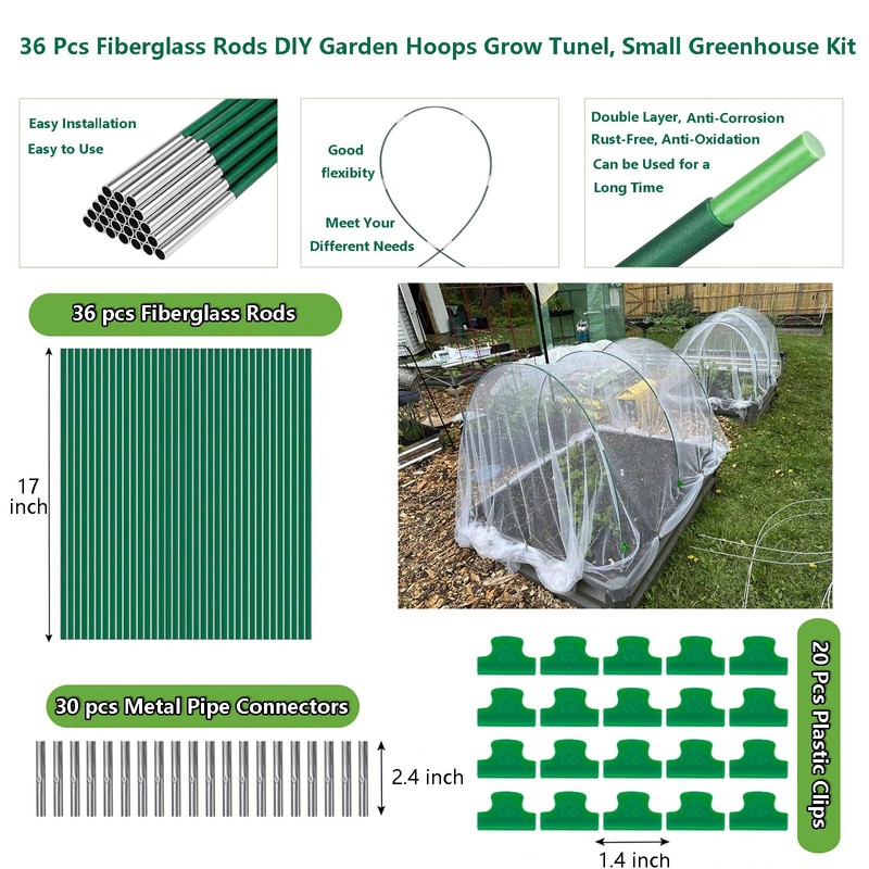 - Package: Greenhouse Hoops kit comes with 36 fiberglass hoops, 17" in length, 30 connectors, and 20 clips. They can be matched with different types of covers to protect your plants from all seasons.