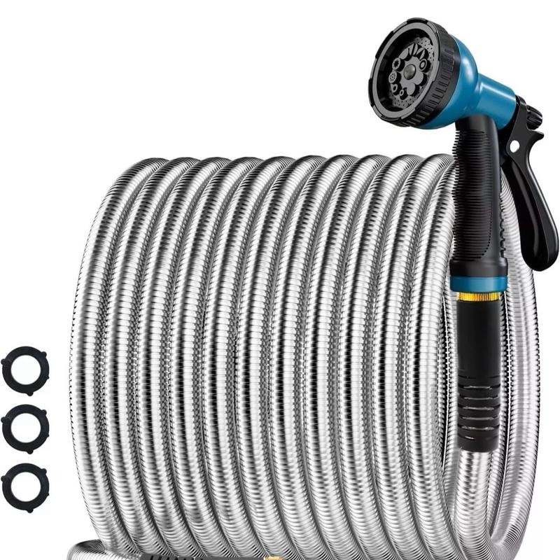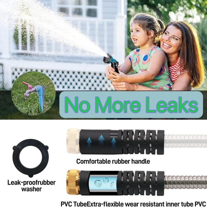 Introducing our premium garden hose, made with premium 304 stainless steel and reinforced PVC inner tubing, ensuring durability and reliability in all weather conditions. The rust-resistant and puncture-proof design of the hose makes it a reliable and long-lasting option for your gardening needs. The unique spiral structure design of the hose prevents kinks and tangles, ensuring smooth and uninterrupted water flow, making it easier to use and store.