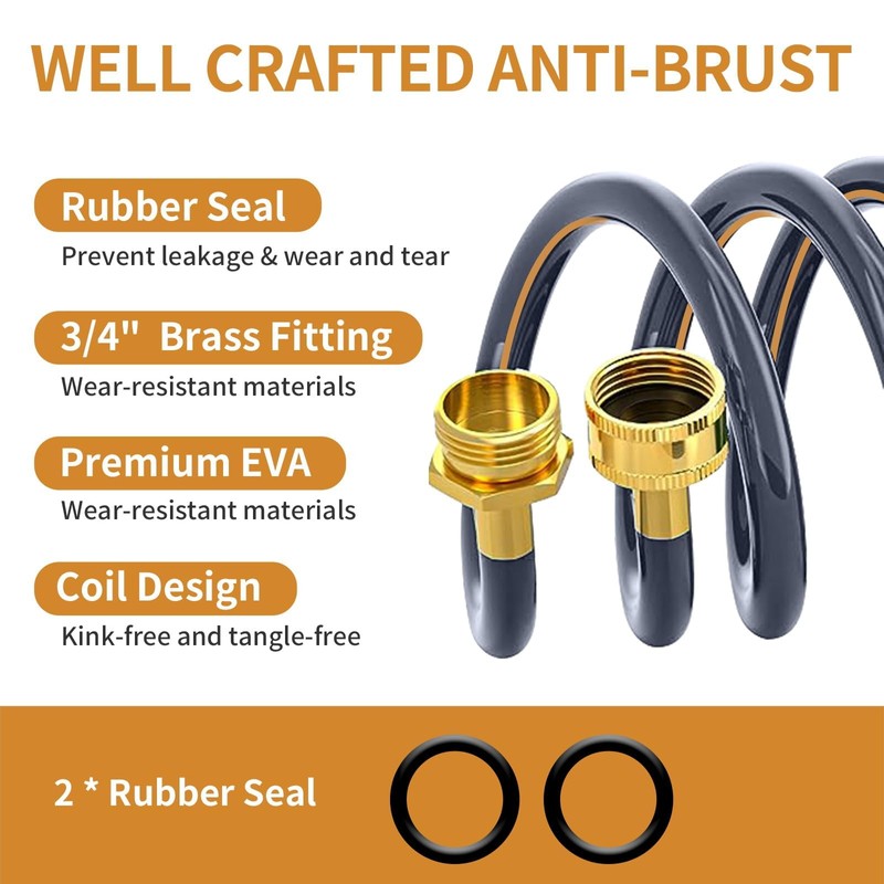 - 【Premium Components】Our EVA Coiled Garden Hose features a 3/8" ID and 1/2" OD, perfectly suited for patio, garden, and outdoor applications. The universal 3/4" male-female brass interface guarantees sturdy and corrosion-resistant connections. To provide a leak-free experience, we've included 2 rubber washers pre-installed in the hose, along with 2 additional spare washers for your peace of mind.