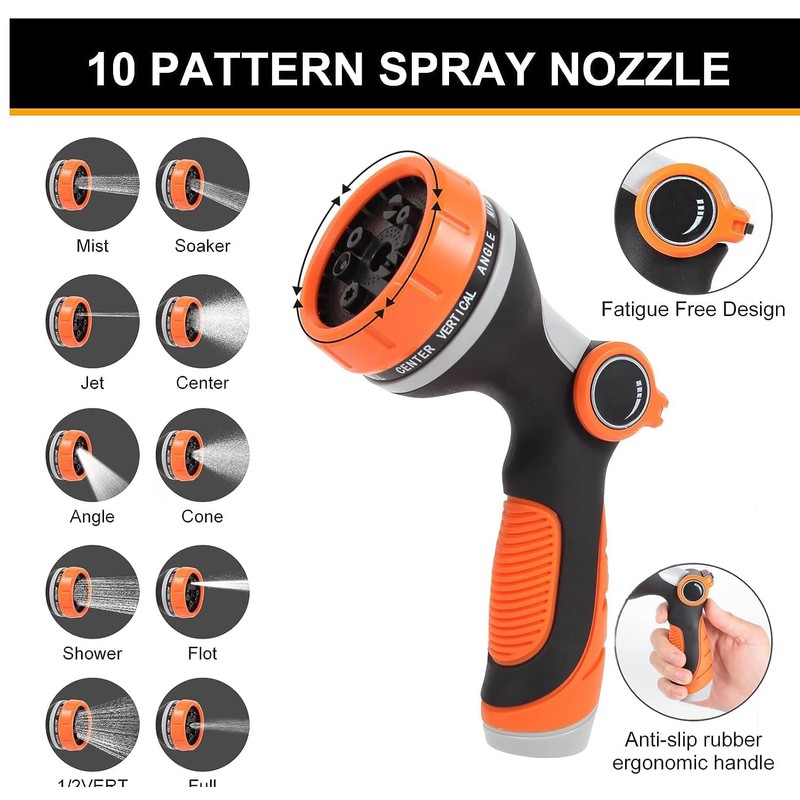 - 【Versatile Spray Nozzle】Enhancing your watering experience, this hose comes with a multi-functional spray nozzle offering 10 different spray patterns. From gentle misting to powerful jet streams, it allows you to tailor the water flow to your specific needs. The ergonomic rubber handle ensures a comfortable grip and prevents accidental slips, providing optimal control and precision.