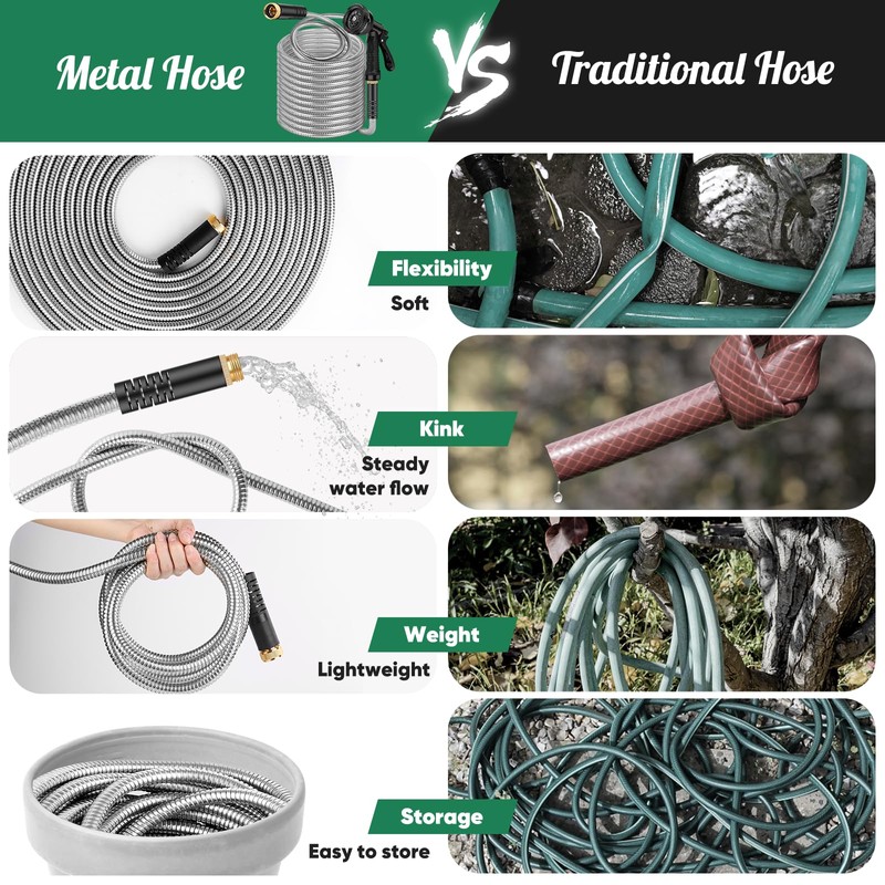 - Sturdy: Garden hose can withstand extreme weather conditions can be used normally in hot weather or rainy and snowy weather. Unlike traditional rubber hoses under direct sunlight that can harden and burst, metal water hoses have a longer service life. The 50ft hose has 3/4 connections on both sides and can be spliced with other lengths of hose to meet different length requirements.