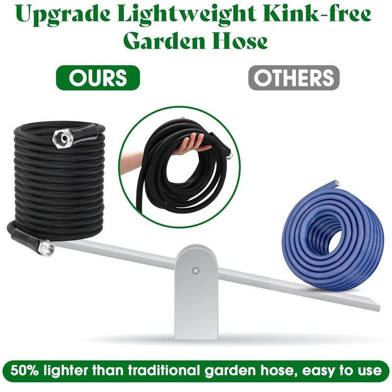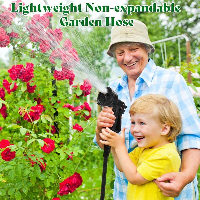 - 【Upgraded Lightweight Water Hose】New non-expandable garden hose made of flexible PE inner tube and waterproof & wear-resistant fabric skin, 50% lighter than traditional garden hoses while maintaining durability.