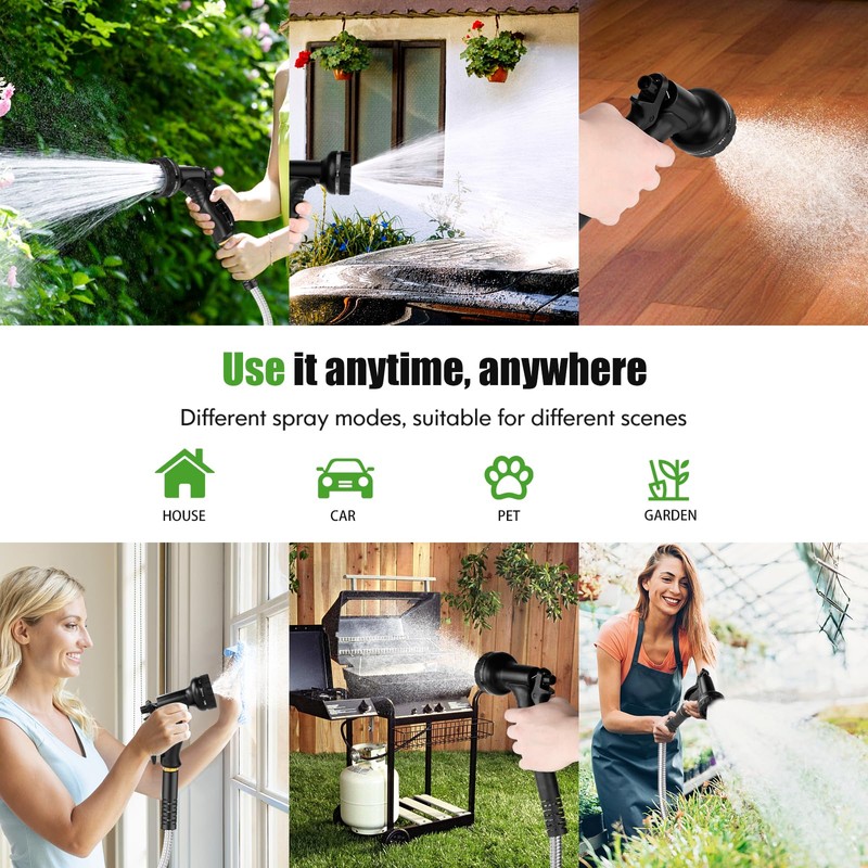 - Garden Hose Metal nozzle is made of metal zinc alloy and ABS plastic for greater durability and corrosion resistance. The thumb control makes this nozzle easy to hold and switch. In addition, the ergonomically designed nozzle grip features a non-slip rubber pad that is more comfortable to use and prevents slippage. The rotating baffle allows you to choose from 10 spray patterns to meet all your needs. Can be used for watering gardens and cleaning houses, cars, yards, pet bathrooms, and so on.