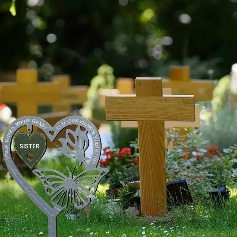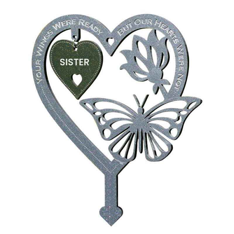 - Garden Grave Memoeria: Garden Memorial Plaque is uniquely designed with a heart-shaped structure and butterfly pattern, symbolizing the transformation of life and eternal love. The oval shaped label in the center is engraved with the words "SISTER" and the touching English sentence "YOU WINGS WERE READY, BUT OUR HEARTS WERE NOT", Expressing deep nostalgia for the deceased.