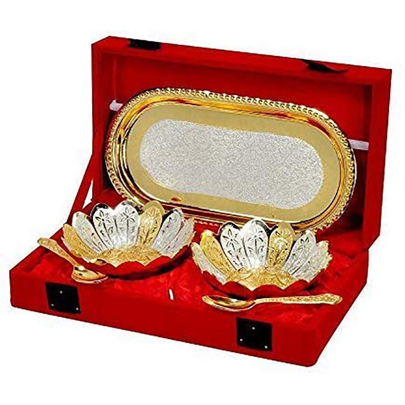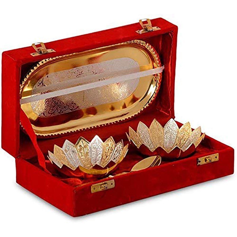 Garden Of Arts Fancy Metal Gold and Silver plated Floral Flower shape 5 Pieces Set 2 Bowls 2 Spoons 1 Tray in Red Velvet Box ideal for dryfruits party prop also known as pandan