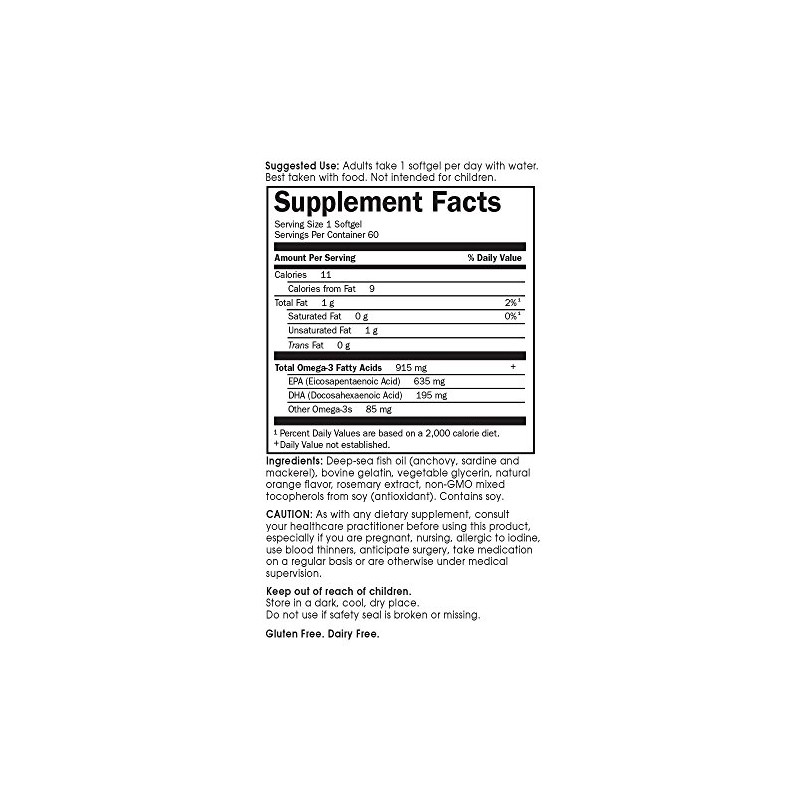 • 3 contiene 635 mg de EPA y 194 mg de DHA para apoyar la salud del corazón. Lo mejor de todo es que una sola cápsula suave al día, con sabor naranja y que no deja rastro de pescado, le brinda la salud que requiere.