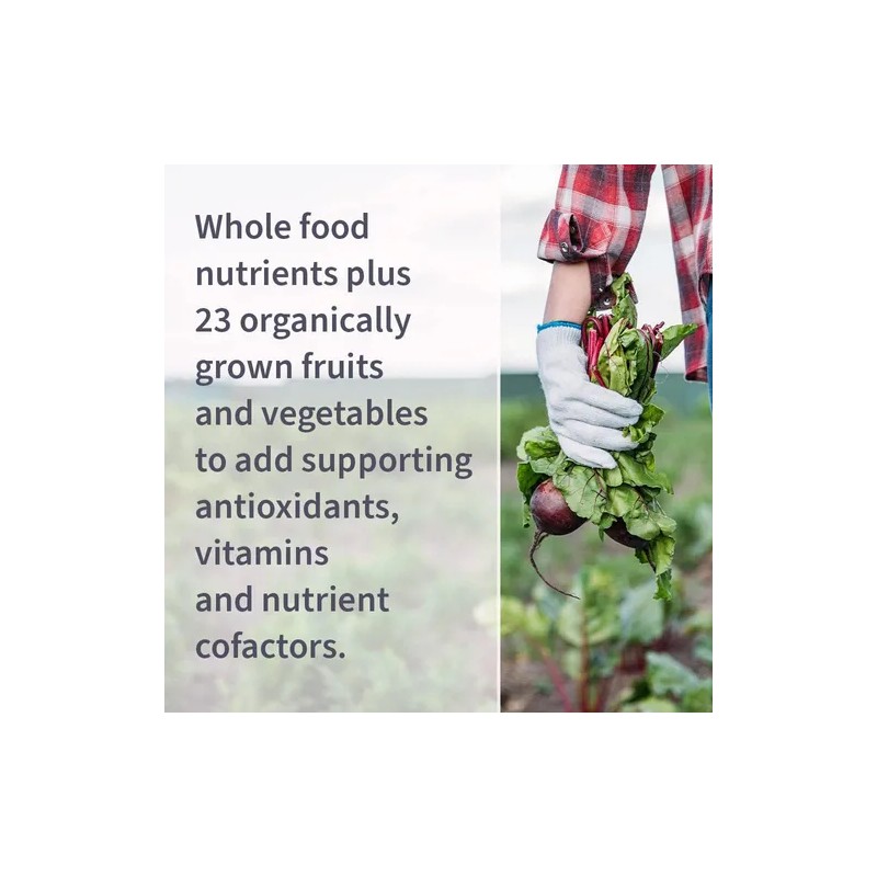 Contiene 23 frutas y vegetales en polvo, cultivados de manera orgánica, que aportan antioxidantes, vitaminas y cofactores nutritivos de refuerzo.