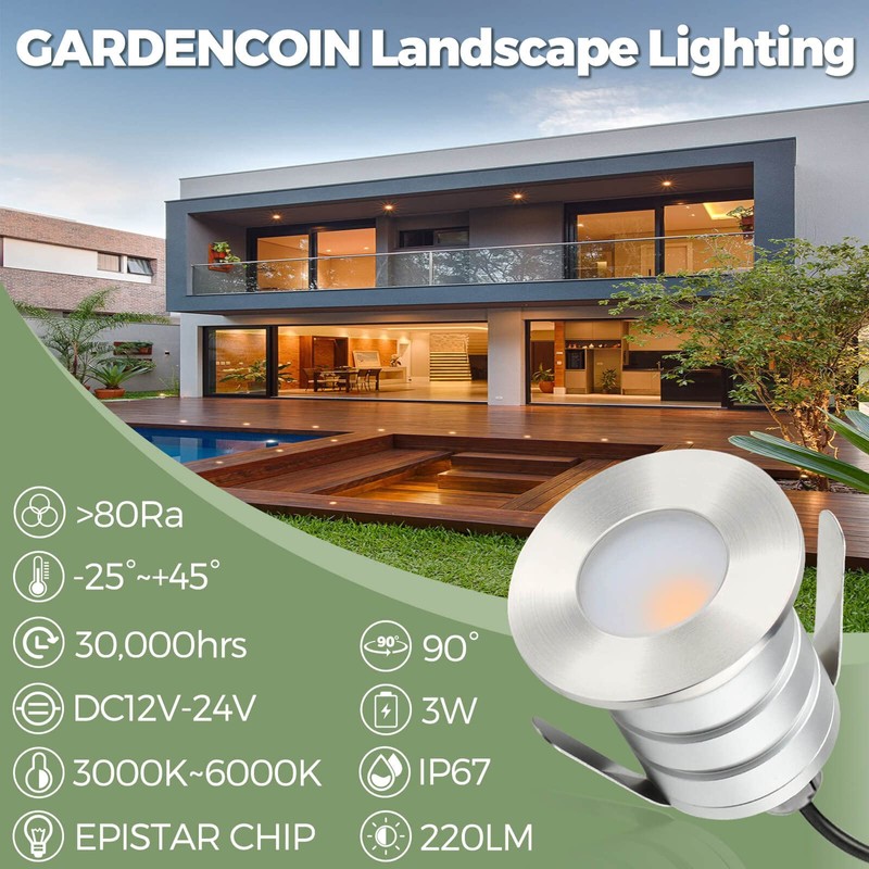 - ✅New upgrade from Gardencoin: With EPISTAR LED, chip-on-board (COB) packaging process, average lifespan up to 30,000 hours, luminous flux 220 lumens each, CRI index > 80Ra, 90° beam angle, 3W Power, Class A ERP energy efficiency certification, DC12V-24V working voltage, common with most outdoor transformers.UL,CE,RoHS listed.