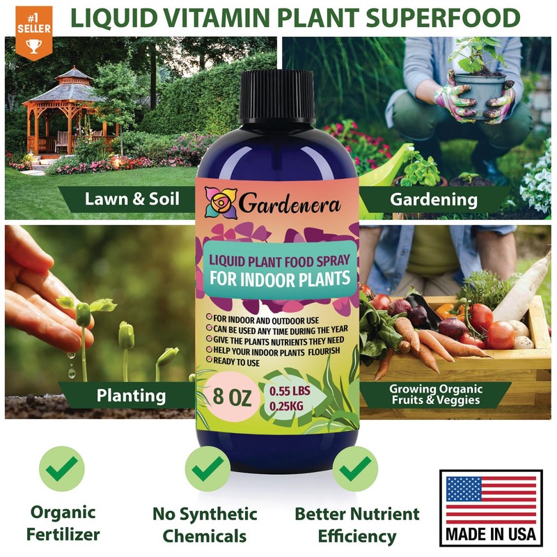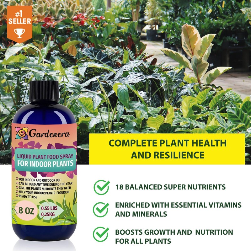 • 🌼 CONVENIENT READY-MIXED SOLUTION: Gardenera has made plant care a breeze for you. This liquid fertilizer comes pre-mixed in a handy spray bottle, creating a fine mist that's perfect for gentle weekly feedings. Say goodbye to complicated mixing and hello to effortless plant care.