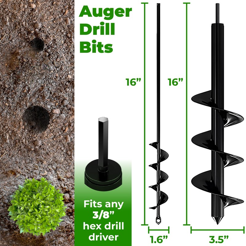 GardenGear Auger Drill Bit for Planting 2 Pack with Soil Mixer C 1.6 x 16 Inch & 3.5 x 16 Inch Set - Garden Earth Auger and Bulb Planter Tool - Hole Digger for 3/8 Inch Hex Drive