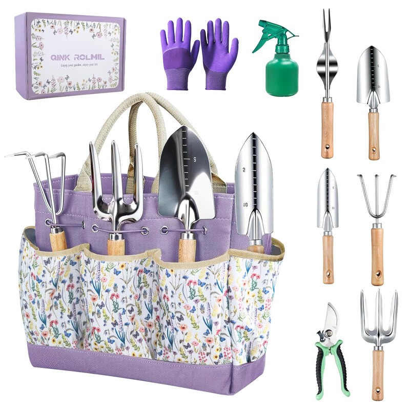 - One for All Package:QINK ROLMIL gardening tool set includes a total of 8 tools and 1 storage bag. Pruning shears, weeder, planter, cultivator, spray water bottle, gloves and so on, almost all the tools for daily garden maintenance.