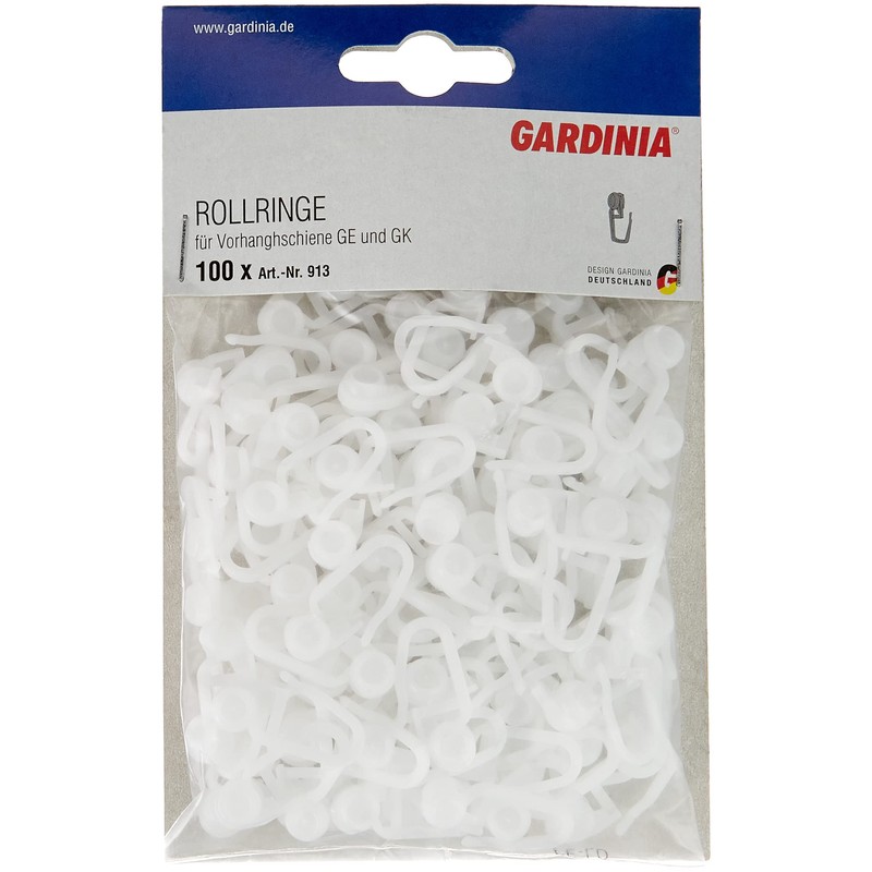 - Contents: 100 GARDINIA Rollers With Hooks, For GE And P2U Curtain Rod Models, Plastic, White