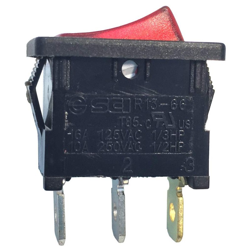 Red illuminated mini-rocker switch, single pole single throw on/off, .188 inch spade terminals, 15a, 125V, Carded.