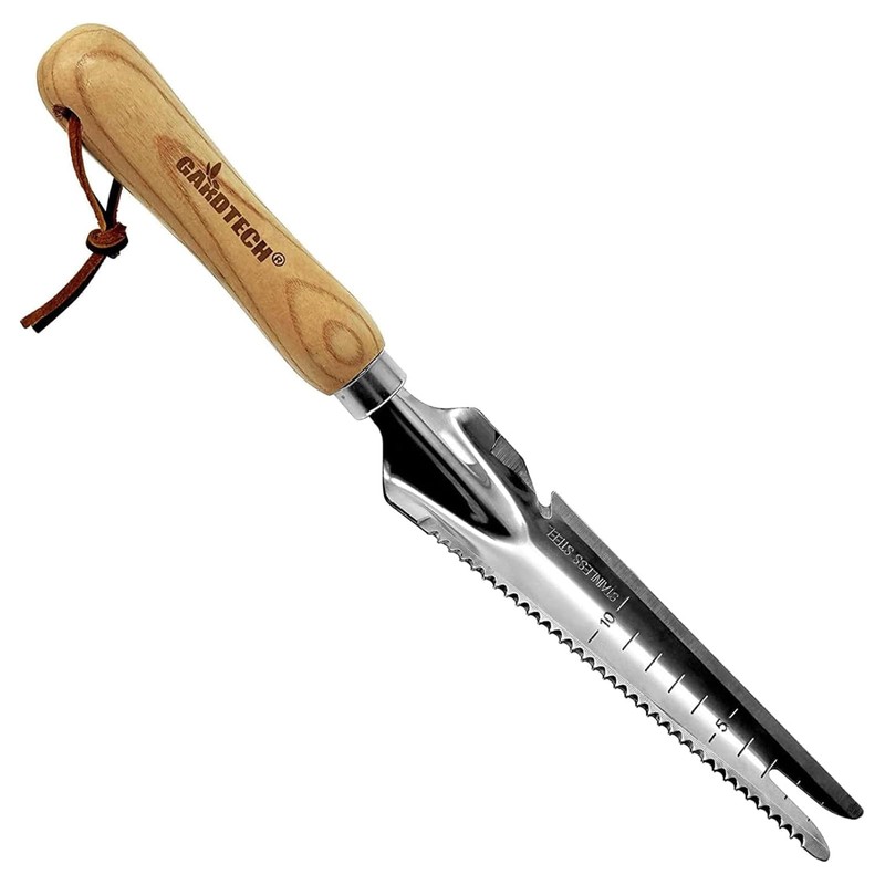 Gardtech Manual Weeder Wooden Handle Stainless Steel Head with Measure Weed Cutter for Removing Weeds Plants Vegetables Flowers Digging Pruning Cutting