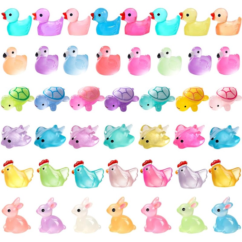 Garedeko Mini Resin Animals 50 Pack Mini Ducks Flamingos Turtles Rabbits Chicken Sting Ray Tiny Ducks Little Animals Figures to Hide Small Plastic Ducks Glow in The Dark Statues Easter Gifts Pink