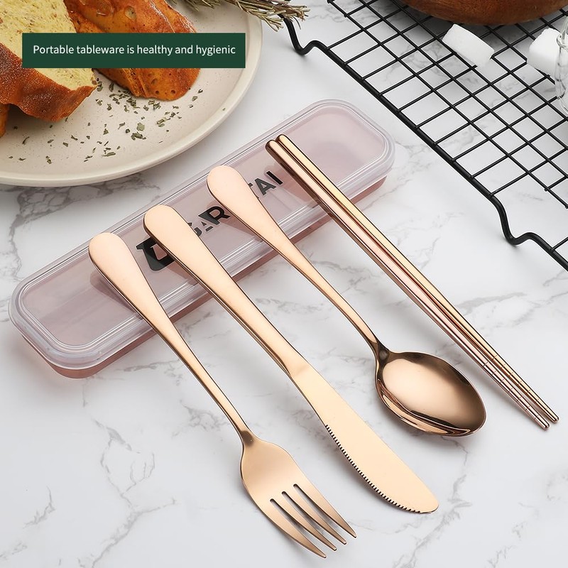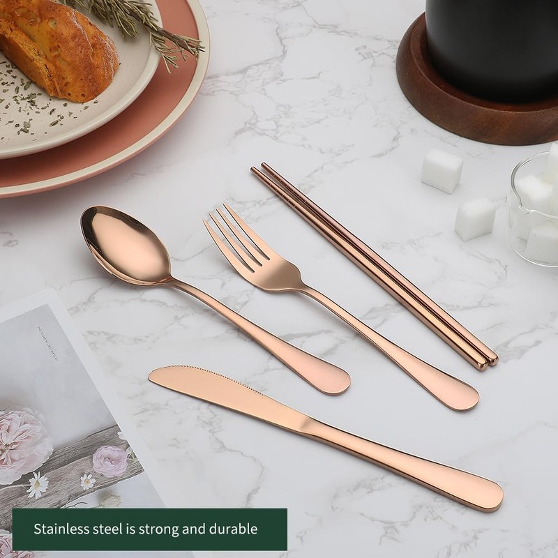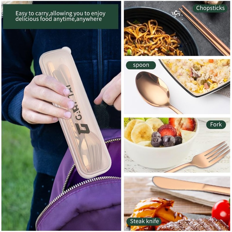 - 4 piece set of reusable utensils set with case : includes 1 knife, 1 fork, 1 spoon, and 1 pair of chopsticks Plus 1 portable travel cutlery box ,A complete set of stainless steel camping spoon fork knife set.it is a great choice for both camping flatware and travel utensils
