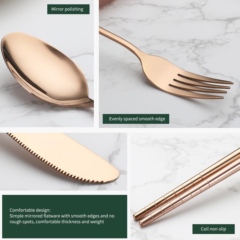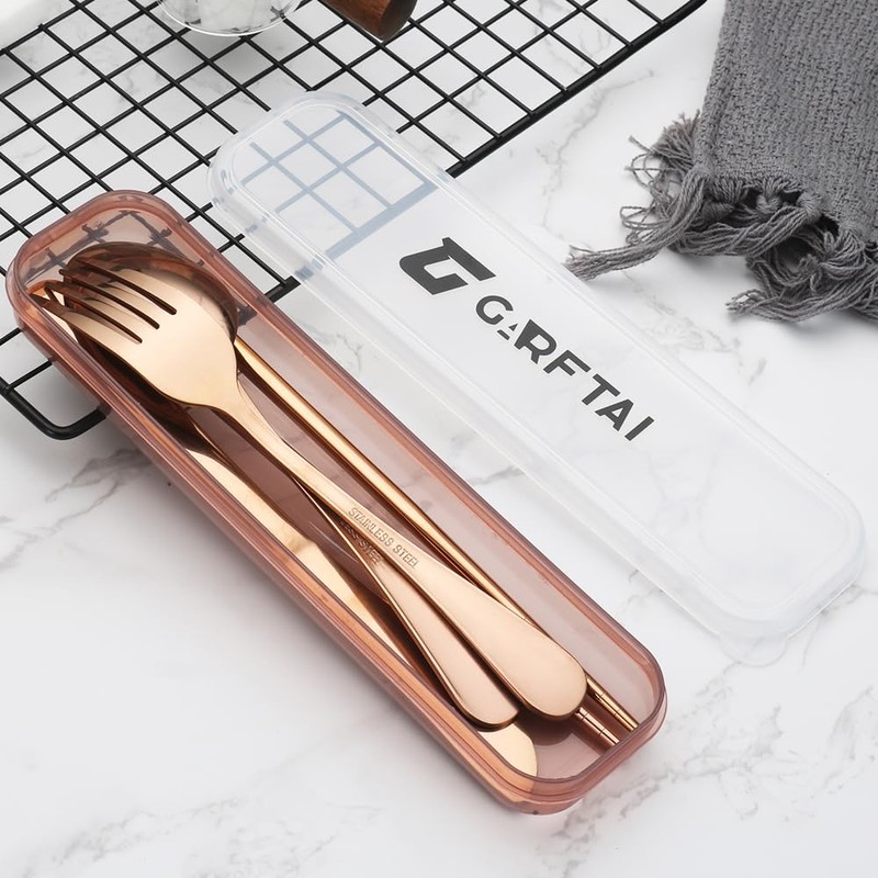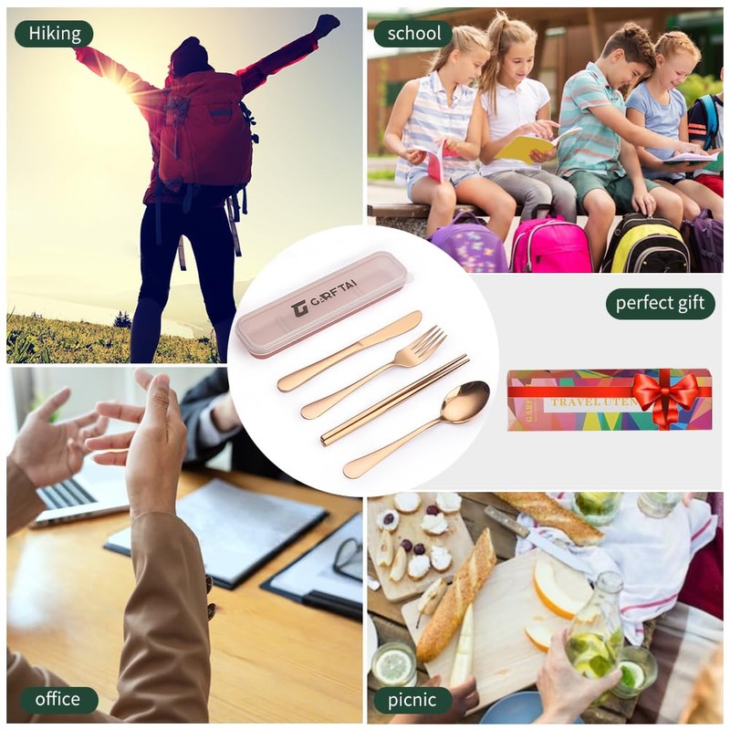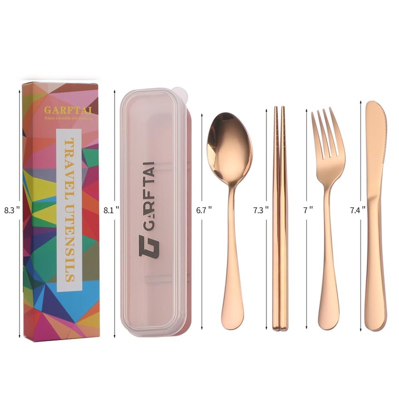 GARFTAI Portable travel utensils set with case. stainless Steel 4pcs travel silverware set. Reusable camping utensils silverware.portable fork knife spoon chopsticks set with case(Rose gold)