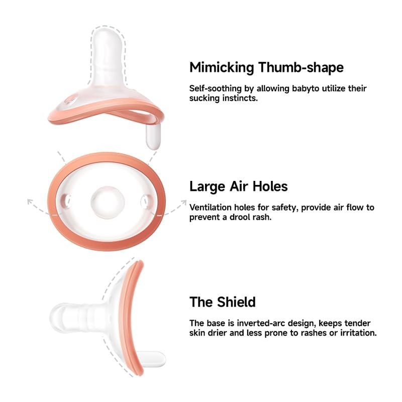 - THUMB NIPPLE SHAPE: Our Pacifiers let your child reduces dependency. Mimicking Thumb-shape design, self-soothing by allowing baby to utilize their sucking instincts. Designed for babies 0-6 months.