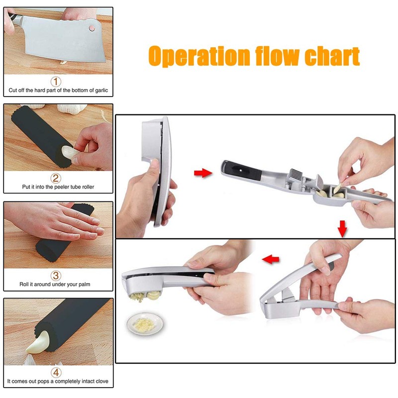 - 【Easy to use】 Our garlic press come with the little silicone peeler tube, Just cut off the head of the garlic and put it into the peeler, then rub with your hands.Put the peeled clove of garlic in the press and close the handle and squeeze the garlic through the screen, out comes mincer garlic and slicer garlic.