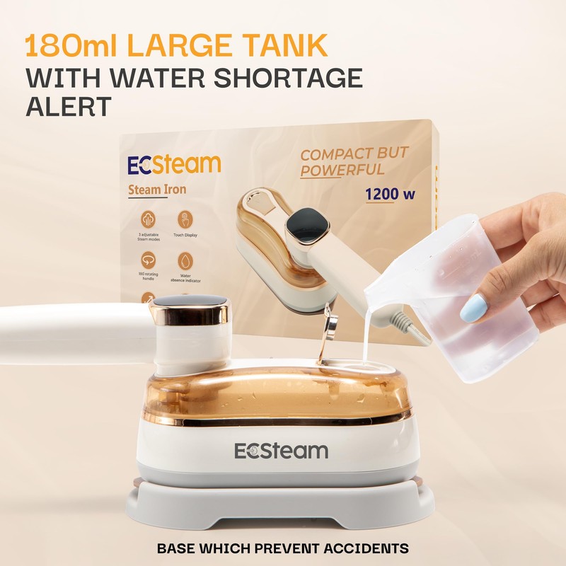 ECSteam Garment Steamer for Clothes, 2-in-1 Portable Handheld Wrinkle Remover & Steam Iron, 1200W Fast Heat-Up, Compact Travel-Friendly Design, 180ml Tank, Ceramic Soleplate, Rotating Handle