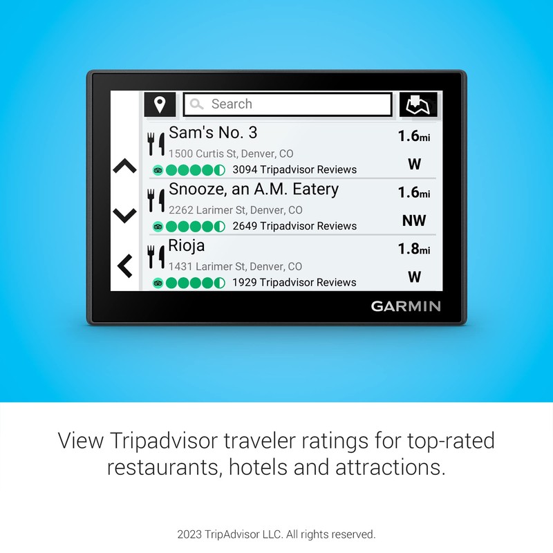 Simplify your drive with Garmin Drive™ 53, the 5” GPS navigator that helps you reach your destination. It features a bright 5” high-resolution glass touchscreen display and modern, beautiful design. With driver alerts, gain more situational awareness for sharp curves, speed changes, school crossings and more. Garmin Drive 53 shows food, fuel and rest stops along your active route. Make the most of road trips by checking the included Tripadvisor® traveler ratings for top-rated restaurants, hotels and attractions. Use the U.S. national parks directory to find visitor centers and notable landmarks within the parks. The Garmin Drive 53 navigator also includes detailed map updates of North America.