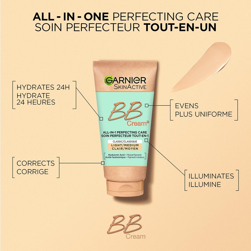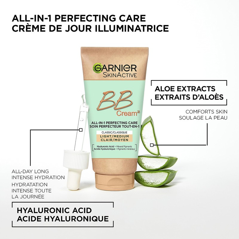 Garnier BB Cream Classic with Hyaluronic Acid + Aloe Vera, 5-in-1 Skin Perfector, SkinActive, Light/Medium - 50ml