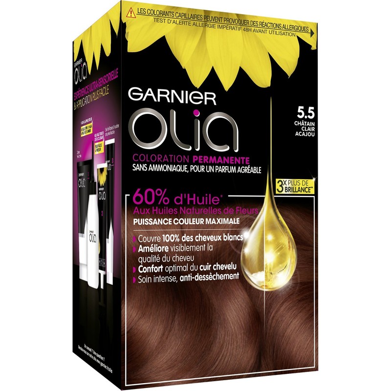 - Box contents: 1 x Garnier Olia permanent dye box, light brown mahogany (5.5), including gloves, hot water bottle, milk bottle, colour cream, care and instructions (English language not guaranteed)