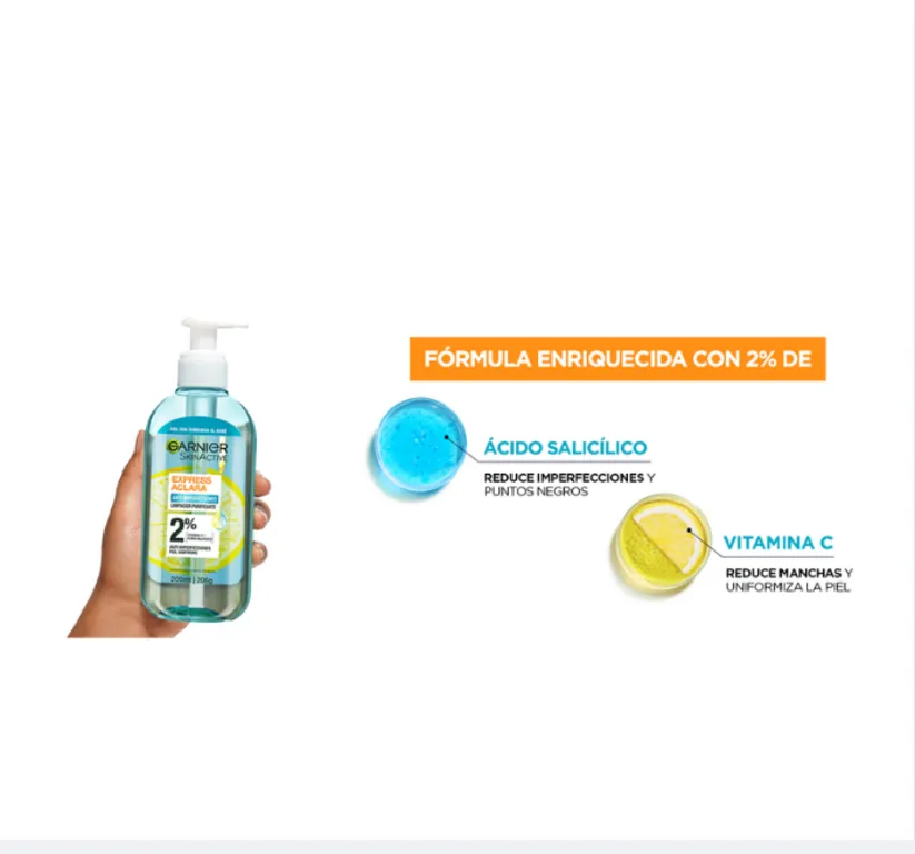 Nuevo Gel Limpiador Facial Express Aclara Anti Imperfecciones para piel con tendencia al acné, tratamiento concentrado (Ácido Salicílico + Vitamina C), limpiador purificante para reducir imperfecciones y manchas por imperfecciones.