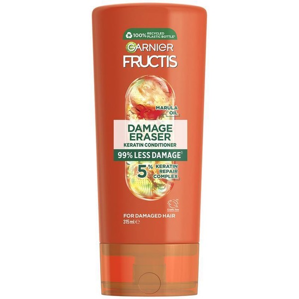 Revive damaged hair with Garnier Fructis Damage Eraser Conditioner. This powerful formula, enriched with a 19% Keratin Repair Complex and Marula Oil, penetrates up to 10 layers deep to refill lost keratin and repair hair fiber to the cortex. Experience up to 99% less damage* as the conditioner seals cuticles and visibly transforms your hair. It strengthens and revitalizes each strand, restoring its natural resistance and leaving it looking healthier and more manageable. This vegan formula is cruelty-free, approved by Cruelty Free International, and dermatologically tested for a gentle yet effective treatment. Indulge your hair with the inner repair, outer transformation power of Garnier Fructis.Size: 315ml