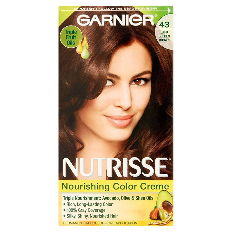 - Garnier Nutrisse Nourishing Female Hair Color Highlights, 43 Dark Golden Brown (Cocoa Bean). Garnier Nutrisse Ultra Crème Nourishing Permanent Hair Color nourishes as it colors with five sustainably sourced oils- avocado, olive, coconut, argan and shea