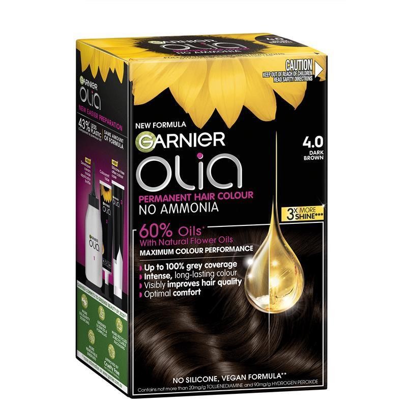 It's time to make an appointment with Olia To bring the best performing salon-inspired hair colour straight to your home, Garnier Olia has developed an improved formula for hair colour. Discover Olia. Oil-powered hair colour for a natural, dark brown. The 1st permanent home hair colour is powered by oil, not ammonia, to reduce damage. Olia's Oil Delivery System infuses colour deep into the heart of the hair fibre to give you maximum colour performance and visibly improve hair quality. 98% of women saw no visible damage*. To keep your hair visibly healthy and for optimal experience during the process, our formula is: AMMONIA FREE SILICONE FREE The Olia hair color range is: Vegan** Approved by Cruelty Free International Under the Leaping Bunny Programme AN EASY APPLICATION KIT With our easy application kit and non-drip velvety formula, everyone can create great hair colour looks, just like a pro. MORE SUSTAINABLE PACKAGING Our new packaging is made with 43% less plastic and 11% less cardboard*** *instrumental Test ** No animal derived ingredients *** compared to the previous kitSize: 1 Unit