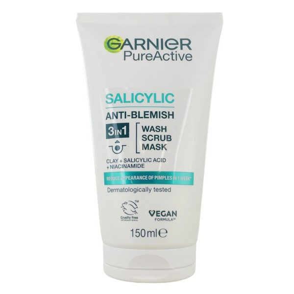 Garnier Pure Active 3 in 1 Wash, Scrub and Mask is a daily cleanser, scrub and mattifying mask to visibly reduce impurities and help prevent their reappearance. Dermatologically tested.